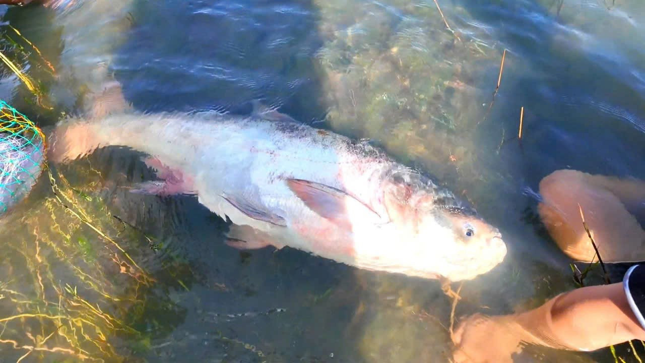 Sau 1 tuần xả tràn điều tiết lũ, Nhà máy thủy điện Trị An ở Đồng Nai đóng đập ngưng xả tràn, người dân lại được dịp bắt cá khủng.