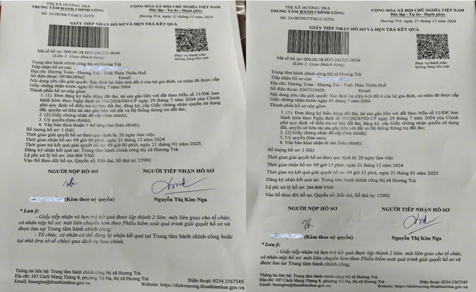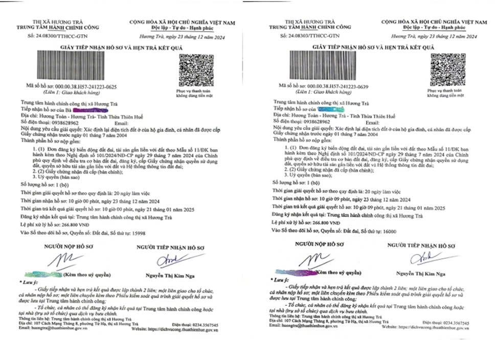 Trước thực trạng trên, nhiều người dân đã chủ động làm thủ tục yêu cầu xác định lại diện tích đất ở để có thông tin rõ ràng, minh bạch trên sổ đỏ. Tuy nhiên, dù đã nộp hồ sơ lên Trung tâm hành chính công thị xã Hương Trà theo đúng quy định, nhưng sau một thời gian dài, họ vẫn chưa nhận được phản hồi từ cơ quan chức năng.