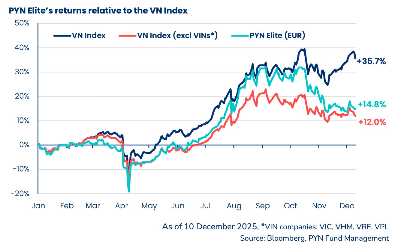 Theo số liệu PYN Elite công bố, tính đến ngày 10/12/2025, VN-Index tăng 16,5%, trong khi giá trị tài sản ròng (NAV) của PYN Elite tăng 14,8%. Quỹ cho rằng kết quả này phản ánh đặc thù của năm 2025, khi diễn biến của chỉ số bị ảnh hưởng bởi một nhóm cổ phiếu có tỷ trọng rất lớn.