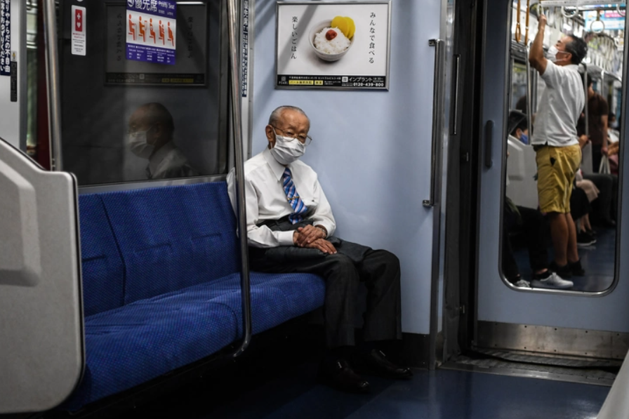 Một người đàn ông lớn tuổi đi tàu một mình ở Tokyo - Ảnh: AFP
