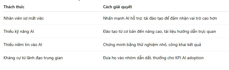 Một số bài học từ thực tiễn như PwC đã mở chương trình "AI Academy" cho toàn bộ 75.000 nhân viên, biến AI thành công cụ quen thuộc hàng ngày. Microsoft khuyến khích chia sẻ "AI Win of the Week" để lan tỏa cách công nghệ này tạo giá trị. DBS Bank (Singapore) lập đội ngũ "AI Ambassador" ở mỗi phòng ban, thu về hàng trăm ý tưởng ứng dụng chỉ trong nửa năm.
