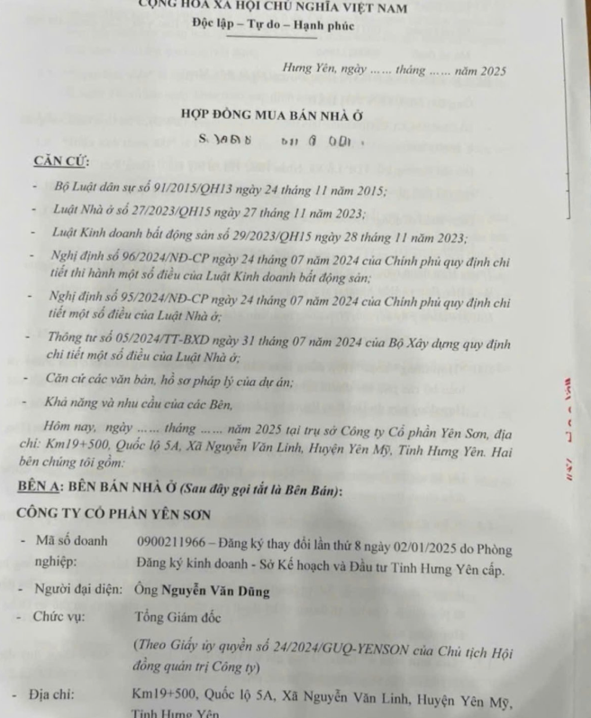 Hợp đồng mua bán nhà ở giữa Công ty Cổ phần Yên Sơn và khách hàng. Ảnh: Sơn Dũng.