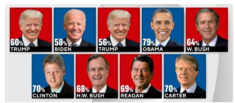 Khảo sát của CBS News vào thời điểm nhậm chức của các Tổng thống như Jimmy Carter, Ronald Reagan, George H. W. Bush, Bill Clinton, George W. Bush và Barack Obama đều cho thấy sự lạc quan và kỳ vọng của người dân Mỹ cao hơn so với thời điểm Tổng thống Biden nhậm chức vào năm 2021 hay khi ông Trump chuẩn bị nhậm chức hiện nay.