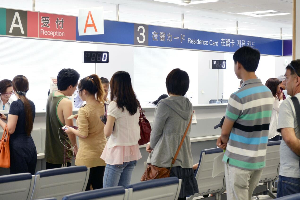 Người nước ngoài xếp hàng nhận thẻ cư trú tại Nhật Bản. Ảnh: Kyodo.