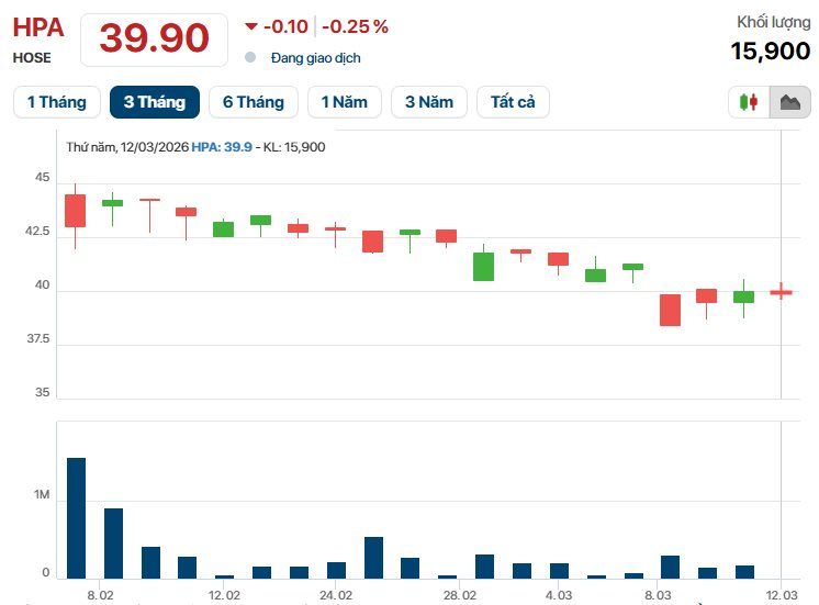 Đóng cửa phiên giao dịch ngày 11/3, cổ phiếu HPA có giá 40.000 đồng/cp, giảm khoảng 7% so với giá đóng cửa phiên đầu tiên lên sàn.