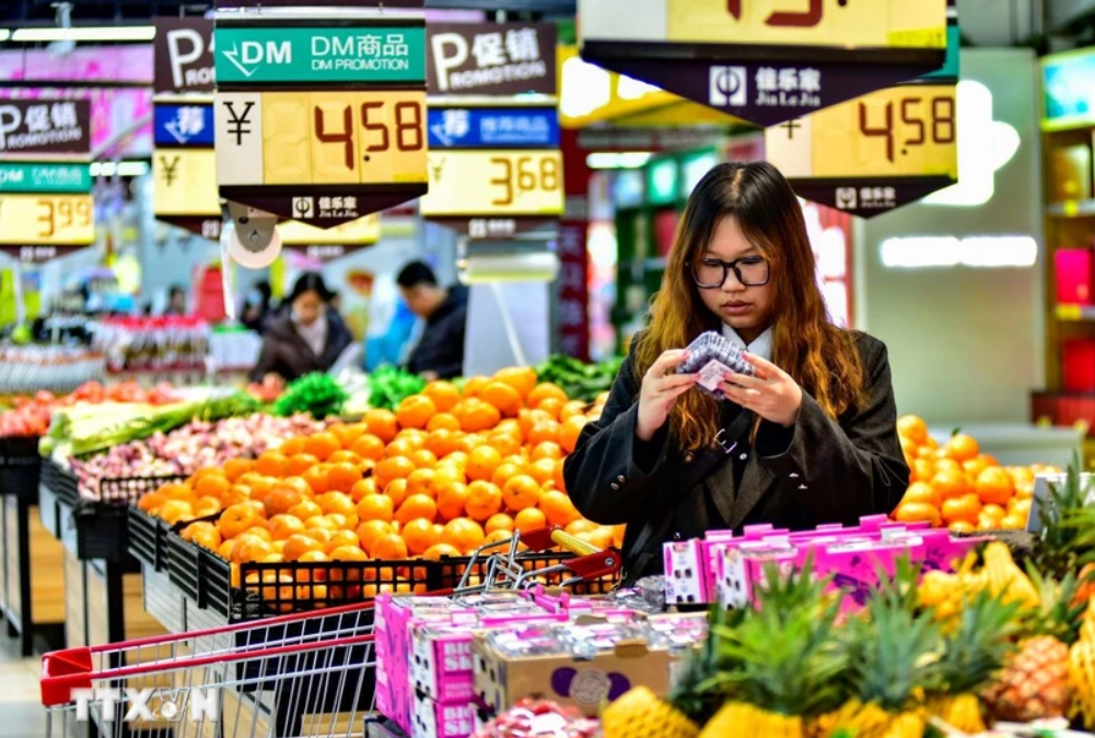 Người tiêu dùng mua sắm tại siêu thị ở tỉnh Sơn Đông, Trung Quốc. (Ảnh: THX/TTXVN)