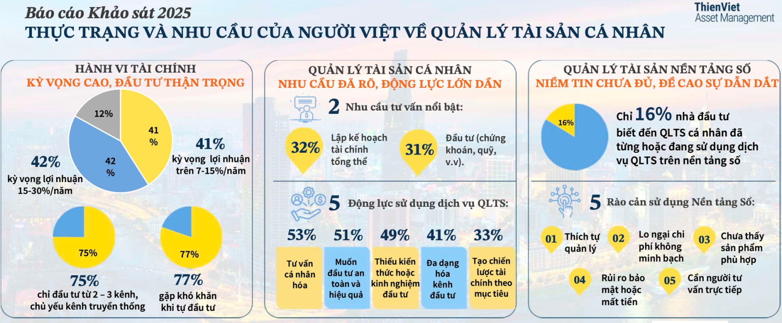 Theo khảo sát về nhu cầu quản lý tài sản cá nhân của người Việt mới đây của Công ty Quản lý Quỹ Thiên Việt (TVAM), có đến 88% nhà đầu tư kỳ vọng lợi nhuận trên 7%/năm, trong đó 42% mong đợi mức sinh lời từ 15–30%/năm, phần lớn vẫn ưu tiên các kênh đầu tư truyền thống gồm tiết kiệm, vàng và bất động sản.