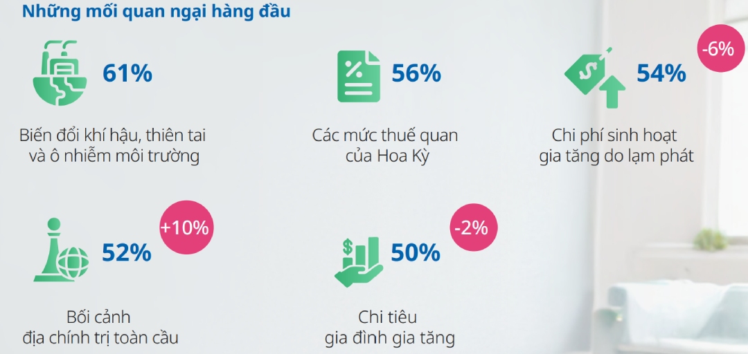 Chi phí sinh hoạt do lạm phát đã không còn là lo ngại hàng đầu của người tiêu dùng Việt Nam trong năm nay, thay vào đó là câu chuyện môi trường và thuế quan.