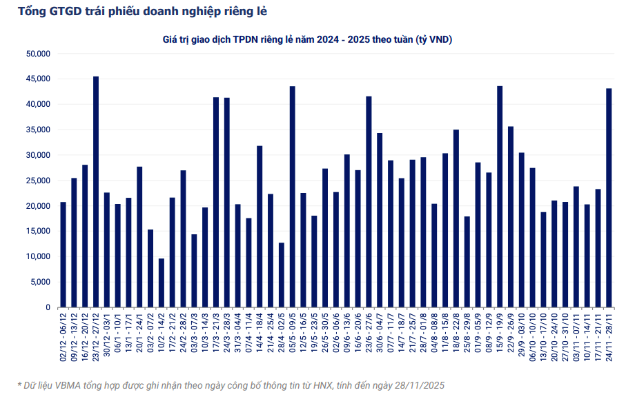 Hoạt động mua lại trước hạn vẫn là điểm nhấn đáng chú ý trong tháng 11, cho thấy nỗ lực tái cấu trúc nghĩa vụ nợ và củng cố thanh khoản của doanh nghiệp phát hành. Riêng trong tuần cuối của tháng, các doanh nghiệp đã mua lại 6.214 tỷ đồng trái phiếu.