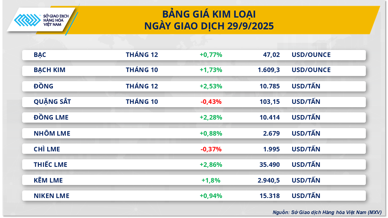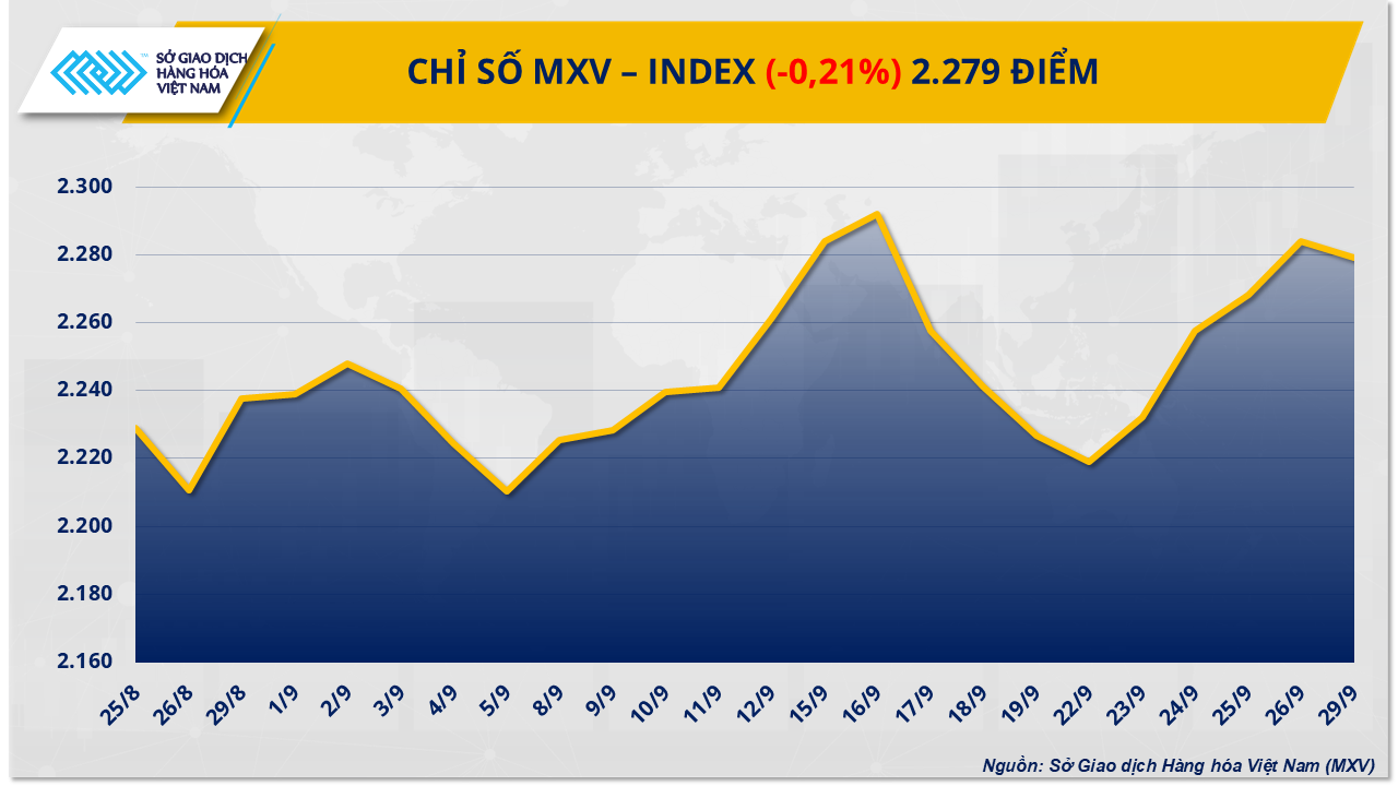 Thị trường hàng hóa toàn cầu chững lại sau chuỗi 5 phiên khởi sắc, khi MXV-Index mất hơn 0,2% xuống 2.279 điểm trong phiên giao dịch đầu tuần (29/9).