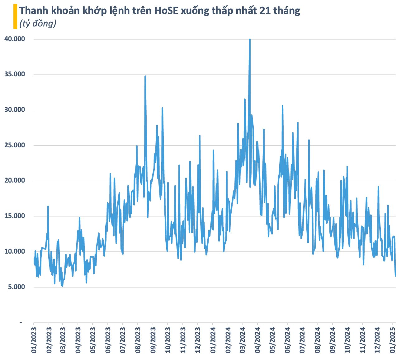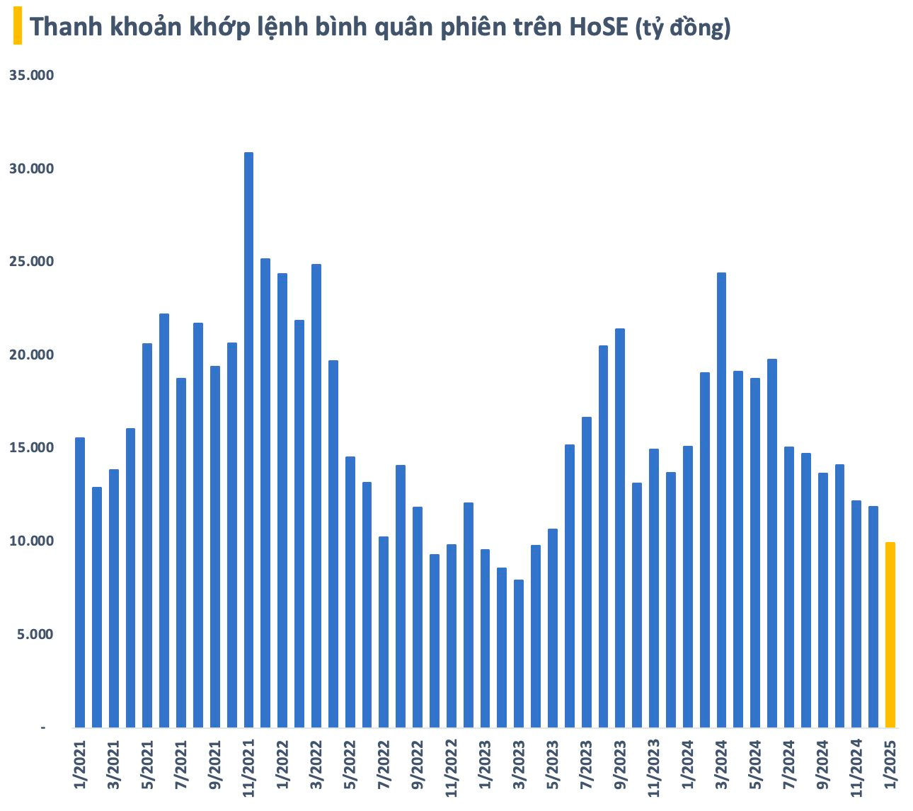 Đáng chú ý, thanh khoản khớp lệnh bình quân phiên trên HoSE từ đầu năm 2025 đã rơi xuống dưới 10.000 tỷ đồng, thấp nhất kể từ tháng 4/2023. Gần Tết chỉ là một trong những lý do mang tính ngắn hạn, thanh khoản đi xuống có lẽ là hệ quả tất yếu của việc tâm lý nhà đầu tư chán nản sau giai đoạn khó kiếm lời trên thị trường chứng khoán.
