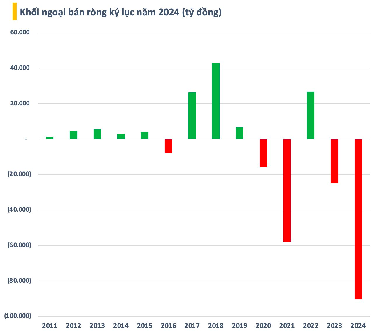 Thêm nữa, áp lực bán từ khối ngoại cũng là yếu tố ảnh hưởng lớn đến thị trường chứng khoán Việt Nam, đặc biệt khi dòng tiền nội suy yếu. Trong năm 2024, khối ngoại đã bán ròng lên đến hơn 90.000 tỷ đồng trên HoSE, con số kỷ lục từ trước đến nay. Mặc dù Thông tư 68 có hiệu lực từ đầu tháng 11/2024 giúp cởi nút thắt Pre-funding nhưng tác động đến dòng tiền ngoại là chưa rõ rệt.