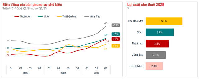Tại các khu vực Bình Dương và Bà Rịa – Vũng Tàu cũ cũng có sự chuyển biến rõ rệt. Giá chung cư ở Vũng Tàu tăng 12% lên 45 triệu đồng/m2, trong khi Thuận An và Dĩ An tăng từ 6–8%. Đặc biệt, Thủ Dầu Một ghi nhận lợi suất cho thuê đạt 5,1% – cao nhất khu vực, gấp đôi so với TP.HCM cũ. Diễn biến này cho thấy dòng vốn đầu tư cho thuê đang dịch chuyển dần về các khu vực lân cận, nơi giá còn “mềm” và tỷ suất sinh lời thực tế hấp dẫn hơn.