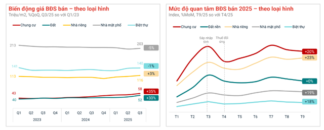 Cụ thể, trong quý 3 vừa qua, loại hình chung cư cũng ghi nhận sự chuyển động tích cực. Tại TP.HCM cũ, giá bán trung bình trong quý 3/2025 đạt 72 triệu đồng/m2, tăng 35% so với đầu năm 2023; trong khi Bình Dương cũ tăng mạnh 30%, lên 41 triệu đồng/m2. Mức độ quan tâm tại hai khu vực này tăng lần lượt 19% và 48%, cho thấy nhu cầu thực và đầu tư đang cùng trở lại. Ở chiều ngược lại, Bà Rịa – Vũng Tàu cũ dù giá nhích nhẹ nhưng vẫn chưa thu hút được lực cầu mới, phản ánh sự phân hóa rõ rệt giữa các địa phương vệ tinh.