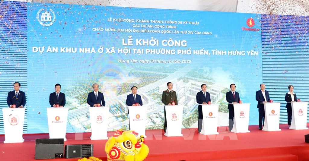 Ngày 19/12/2025, tại phường Phố Hiến (Hưng Yên), UBND tỉnh Hưng Yên và Tập đoàn Vingroup tổ chức Lễ khởi công Dự án Khu nhà ở xã hội. Dự án có tổng vốn đầu tư dự kiến khoảng 7.000 tỷ đồng, xây dựng trên khu đất rộng khoảng 31,5ha với tổng diện tích sàn khoảng 500.000 m2. Dự kiến khu nhà sẽ được bàn giao trong năm 2027 với 25 tòa chung cư. Ảnh: Thế Duyệt – TTXVN