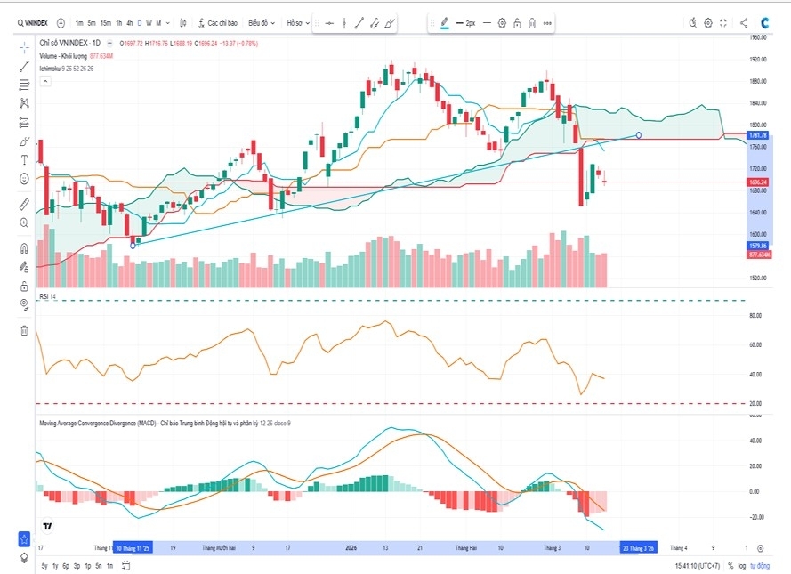 Từ góc nhìn kỹ thuật, VN-Index nhiều khả năng sẽ tiếp tục dao động trong biên độ tương đối rộng trong ngắn hạn khi thị trường đang kiểm định lại các vùng hỗ trợ và kháng cự quan trọng. Trong đó, vùng 1.650–1.680 điểm được xem là khu vực hỗ trợ gần của chỉ số, trong khi vùng 1.720–1.740 điểm có thể đóng vai trò là ngưỡng cản trong các nhịp hồi phục.