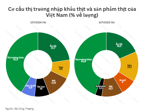 Theo báo cáo của Bộ Công Thương, Ấn Độ tiếp tục là thị trường cung cấp thịt và sản phẩm từ thịt lớn nhất của Việt Nam trong 10 tháng đầu năm 2025 với 150.200 tấn, đạt 535,5 triệu USD, giảm 5,8% về lượng và tăng 0,8% về giá trị so với cùng kỳ.