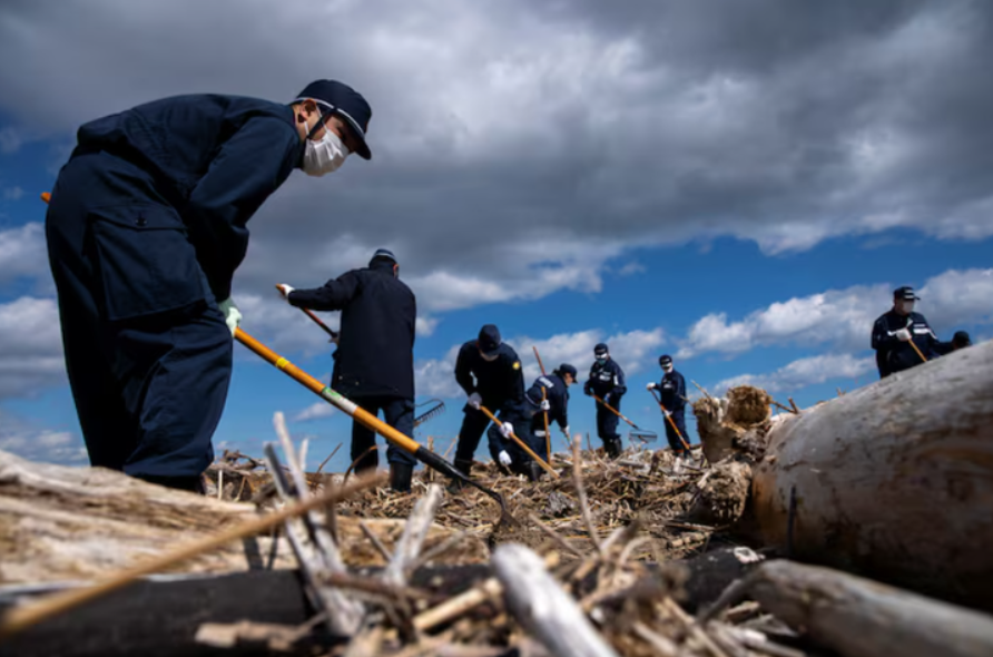 Các sĩ quan cảnh sát tham gia vào hoạt động tìm kiếm hài cốt của những người mất tích sau thảm họa động đất và sóng thần tại Namie, tỉnh Fukushima, Nhật Bản ngày 11-3-2011- Ảnh: REUTERS