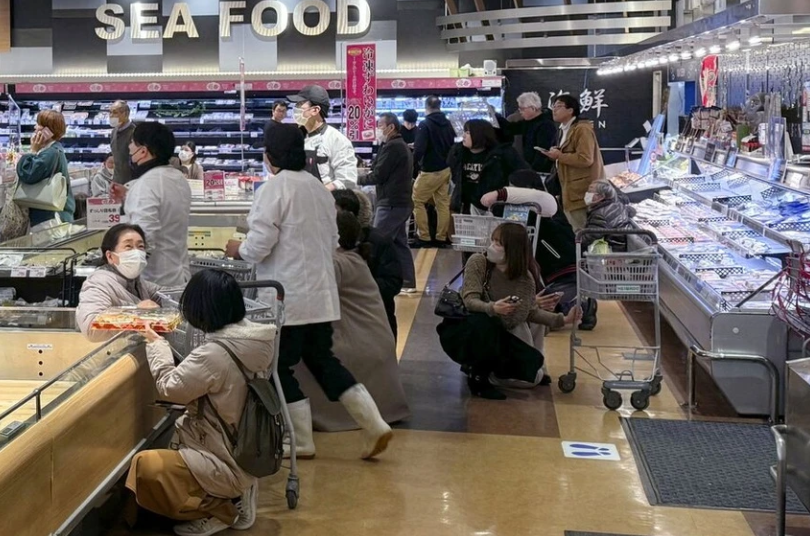 Khách hàng hoảng hốt cúi người tìm chỗ an toàn trong siêu thị ở Toyama, Nhật Bản, sau trận động đất ngày 1/1/2024. Ảnh: Reuters.