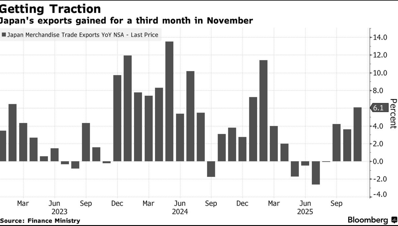 Theo số liệu do Bộ Tài chính Nhật Bản công bố giữa tháng 12, kim ngạch xuất khẩu trong tháng 11 tăng hơn 6% so với cùng kỳ năm trước, vượt dự báo của phần lớn các tổ chức phân tích quốc tế.