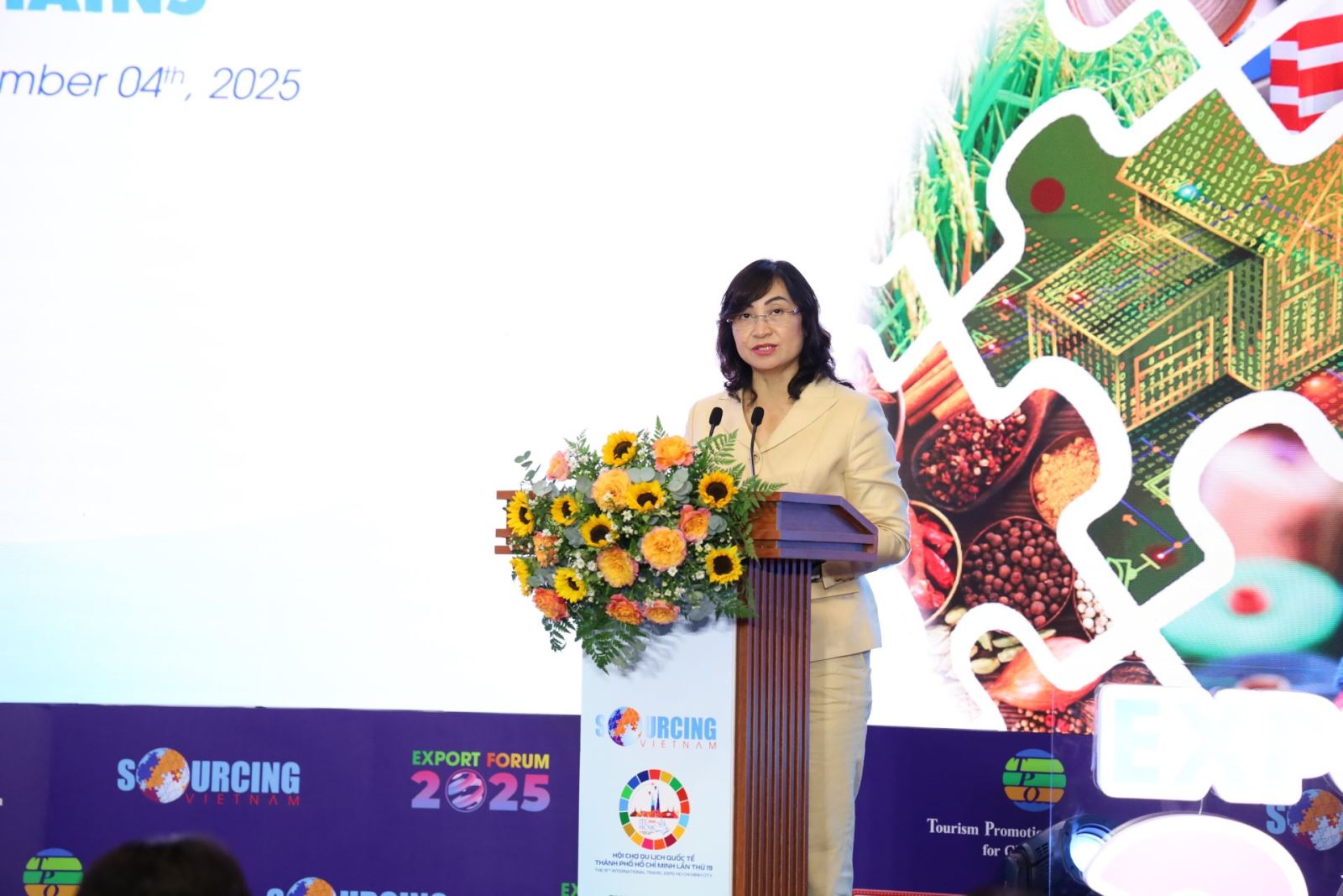 Bà Phan Thị Thắng, Thứ trưởng Bộ Công Thương, phát biểu tại sự kiện Diễn đàn xuất khẩu năm 2025 tại TP.HCM ngày 4/9/2025. Ảnh: Ban tổ chức.