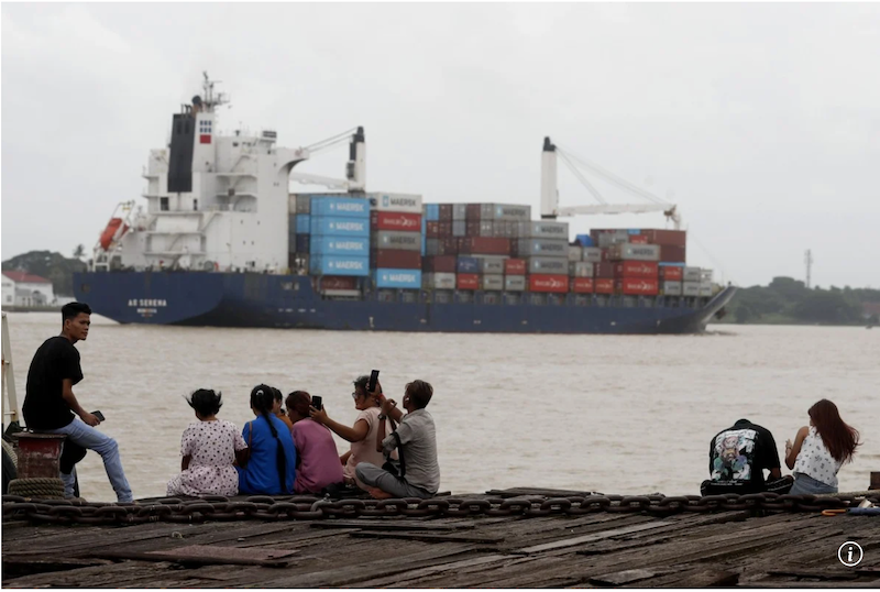Tàu chở hàng container đi qua một cảng tại Myanmar, nơi Tổng thống Hoa Kỳ Donald Trump đã đe dọa áp thuế 40%. Ảnh: EPA