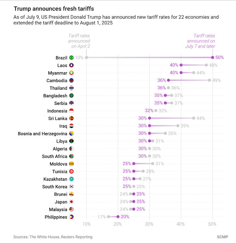 Tổng thống Trump công bố mức thuế quan mới với các quốc gia. Đồ hoạ: SCMP