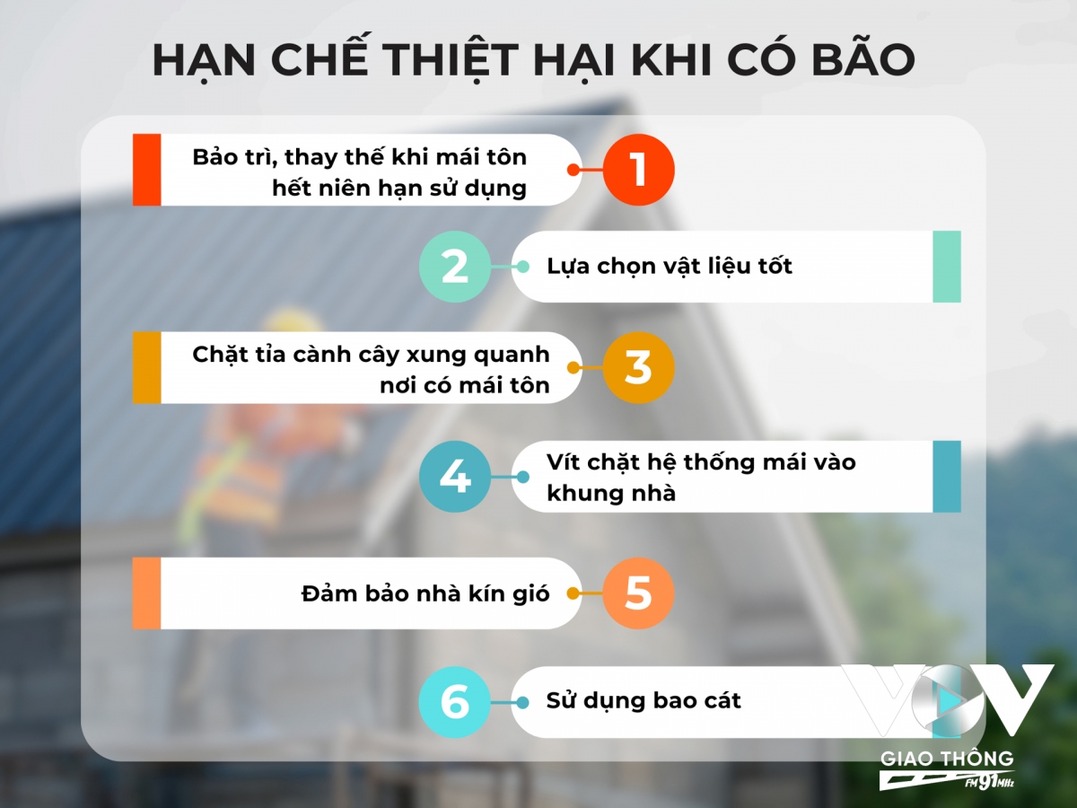 4. Vít chặt hệ thống mái vào khung nhà: người dân cần cố định mái tôn trước khi bão đến bằng cách vít chặt hệ thống mái vào khung nhà. Bởi mái tôn nhẹ nên dễ bị gió bão tốc, lật, thổi bay.