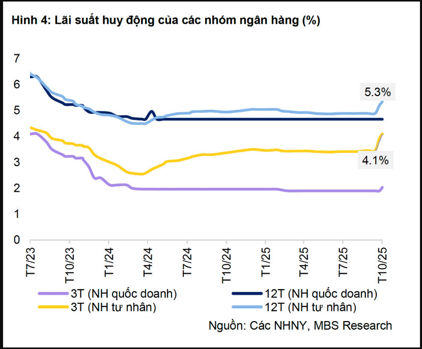 Báo cáo của Công ty Chứng khoán MBS cho biết riêng tháng 10 đã có 6 ngân hàng tăng lãi suất, trong đó LPBank đang dẫn đầu với mức 6,1%/năm cho kỳ hạn 12 tháng. Xu hướng này phản ánh nhu cầu huy động vốn tăng mạnh, khi các ngân hàng cần chuẩn bị nguồn cho vay dịp cuối năm, giai đoạn tín dụng thường tăng cao theo chu kỳ mùa vụ.