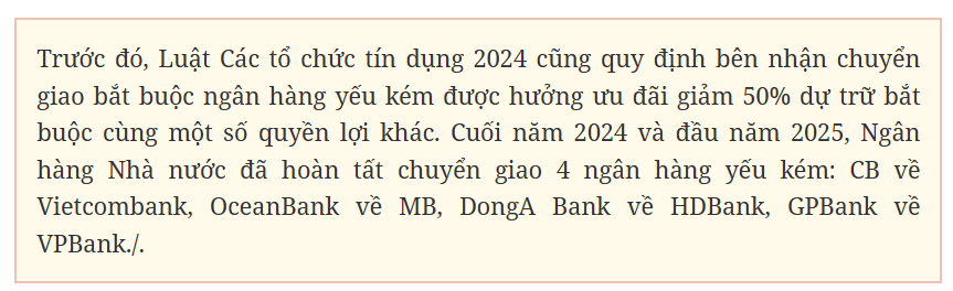 Việc chuyển giao bắt buộc kỳ vọng giúp các ngân hàng yếu kém xử lý lỗ lũy kế, thoát kiểm soát đặc biệt; đồng thời, tạo động lực cho ngân hàng nhận chuyển giao nhờ các ưu đãi về vốn, room tín dụng để mở rộng quy mô và thúc đẩy tái cấu trúc thành công hệ thống./.