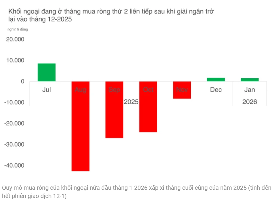 Và xu hướng này tiếp tục được duy trì trong nửa đầu tháng 1-2026, khi khối ngoại mua ròng hơn 1.500 tỉ đồng.