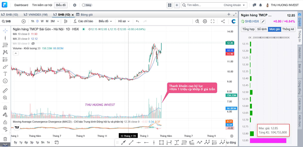 Ví dụ, kéo trần SHB ngay từ đầu phiên sáng thứ 6, ngày 18/04, vừa đỡ điểm thay VIC, VHM nhưng cũng tạo fomo mạnh cho NĐT nhỏ lẻ với hơn 100 triệu cổ phiếu khớp lệnh ở giá trần trong suốt phiên, trong khi các mức giá thấp hơn lại rất ít khối lượng giao dịch.
