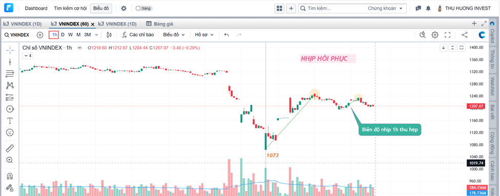 +Cấu trúc nhịp hồi: các nhịp bật tăng trên khung 1h thể hiện sự suy giảm về biên độ. Biên độ nhịp sau ngắn hơn biên độ nhịp trước, đỉnh sau thấp hơn đỉnh trước-> dòng tiền suy yếu.