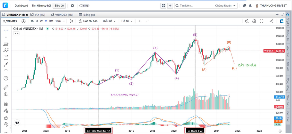 -Dài hạn: NĐT đang đứng trước cơ hội đón sóng Uptrend thập kỷ sau khi sóng chỉnh C kết thúc.