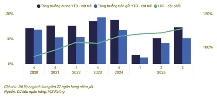 Tỷ lệ LDR toàn ngành tăng lên mức cao nhất trong 5 năm qua. Đến cuối quý III/2025, tăng trưởng tín dụng đạt 13,4%, nhưng tăng trưởng huy động vốn chỉ đạt khoảng 9,7%