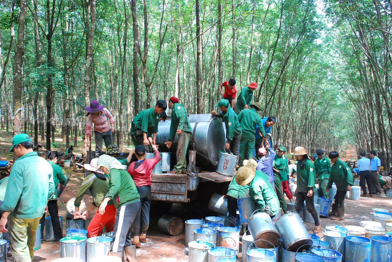 Thu trút mủ trên vườn cây Công ty TNHH MTV Cao su Chư Prông. Ảnh: Văn Vĩnh