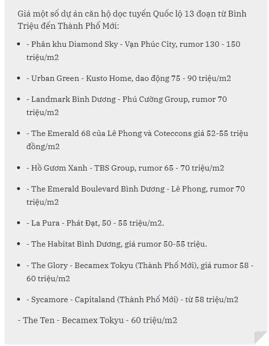 Theo khảo sát, giá đất mặt tiền QL.13 đoạn Hiệp Bình - Bình Triệu đã tăng từ 45 - 55 triệu/m2 (năm 2020) lên 100 - 180 triệu/m2 hiện nay. Các tuyến nội khu lân cận cũng tăng gần gấp đôi, đạt 60 - 80 triệu/m2. Cũng trên trục đường này hướng Bình Hòa đến Thành Phố Mới, từng ở mức 40 - 45 triệu/m2, nay đã tăng lên 55 - 70 triệu/m2.