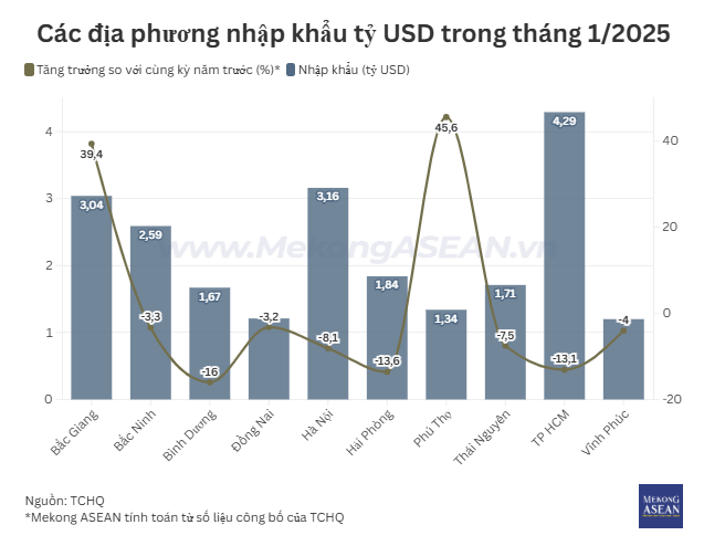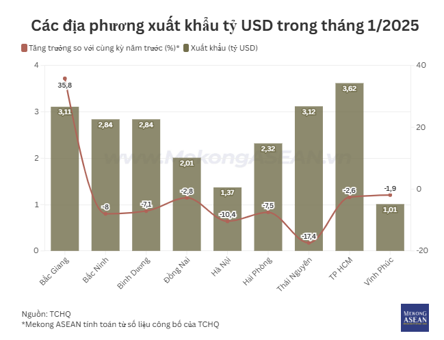 Tháng 1/2025, các địa phương có kim ngạch xuất khẩu trên một tỷ USD bao gồm Bắc Giang, Bắc Ninh, Bình Dương, Đồng Nai, Hà Nội, Hải Phòng, Thái Nguyên, TP HCM và Vĩnh Phúc. Theo Mekong ASEAN tính toán từ số liệu công bố của Tổng cục Hải quan, tổng giá trị kim ngạch xuất khẩu của 9 địa phương này đạt 22,24 tỷ USD, tương ứng chiếm 67% tỷ trọng giá trị xuất khẩu của Việt Nam trong tháng.