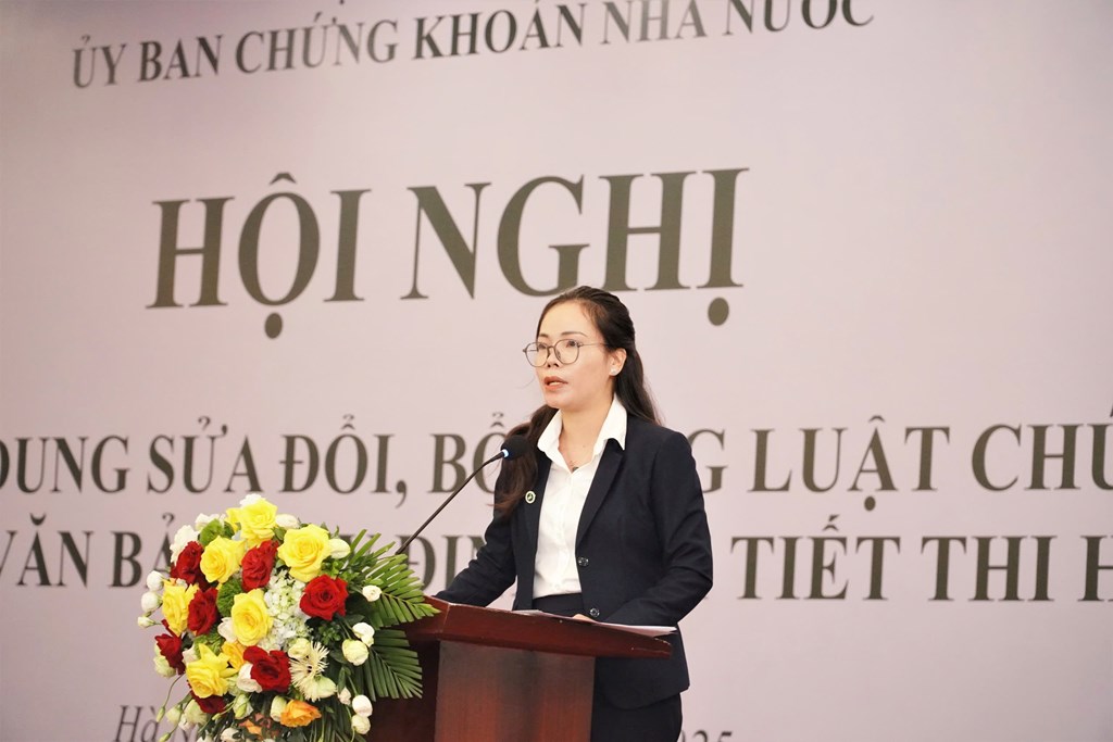 Bà Phạm Thị Hằng Nga, đại diện Ban Quản lý chào bán chứng khoán, Ủy ban Chứng khoán Nhà nước phát biểu tại hội nghị phổ biến nội dung sửa đổi, bổ sung Luật Chứng khoán và các văn bản quy định chi tiết thi hành khu vực miền Bắc. Ảnh Lê Minh/Bnews/vnanet.vn