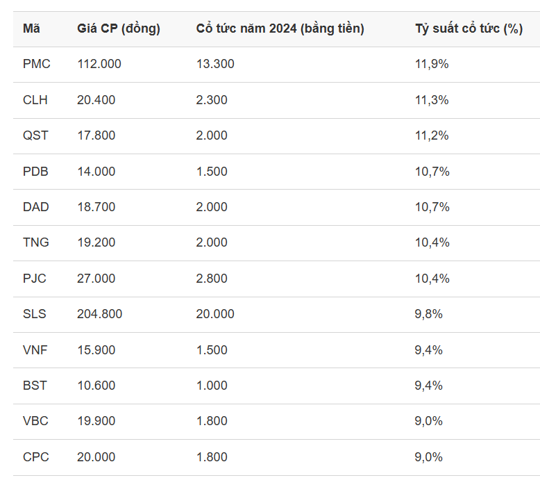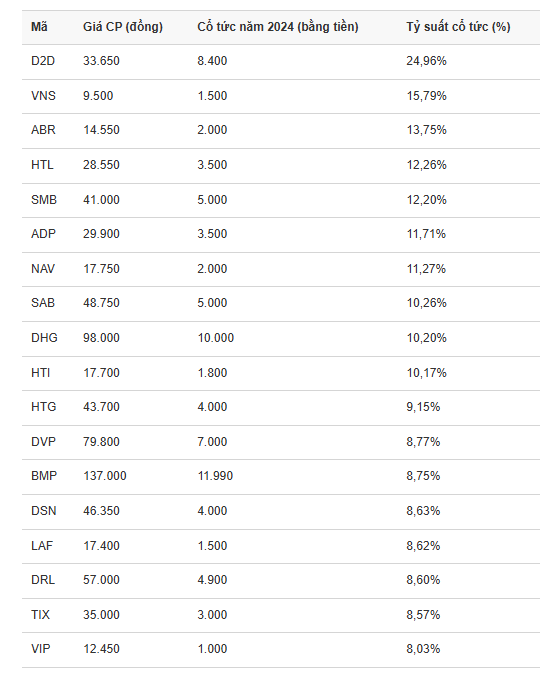Xếp thứ hai là CTCP Ánh Dương Việt Nam (HoSE: VNS) khi trả cổ tức năm 2024 bằng tiền tỷ lệ 15% (1 cổ phiếu nhận 1.500 đồng), tương đương tỷ suất đạt 15,79%; CTCP Đầu tư Nhãn hiệu Việt (HoSE: ABR) trả cổ tức năm 2024 tỷ lệ 20%, tỷ suất cổ tức đạt 13,75%...