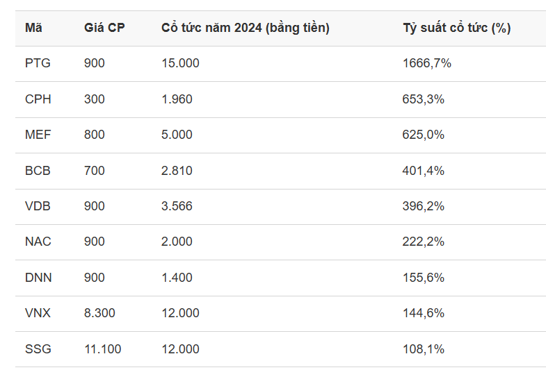 Đáng chú ý, 8 mã xếp đầu danh sách tỷ suất cổ tức đều là những cổ phiếu có giá "trà đá". Trong đó, những cổ phiếu PTG, CPH, MEF, BCB, VDB, NAC, DNN có giá cổ phiếu không quá 1.000 đồng/CP, đây cũng là nguyên nhân khiến tỷ suất cổ tức của những mã này đạt mức rất cao.