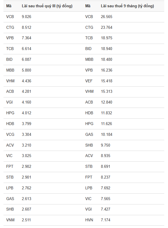Một số doanh nghiệp phi tài chính khác cũng có mặt trong danh sách top 20 lợi nhuận sau thuế quý III là VGI (4.160 tỷ đồng), HPG (4.012 tỷ đồng), VCG (3.304 tỷ đồng), ACV (3.210 tỷ đồng)...