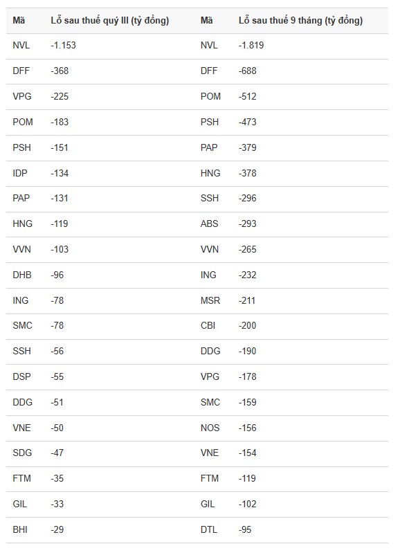 Ở chiều ngược lại, cũng có không ít công ty báo lỗ trong quý III/2025 và 9 tháng đầu năm 2025. Xếp ở vị trí đầu tiên là NVL với mức lỗ 1.153 tỷ đồng. Theo đó, doanh thu công ty bất động sản này quý III/2025 giảm 16% xuống 1.683 tỷ đồng. Biên lợi nhuận gộp cải thiện giúp lợi nhuận gộp tăng 7,5% lên 586 tỷ đồng.