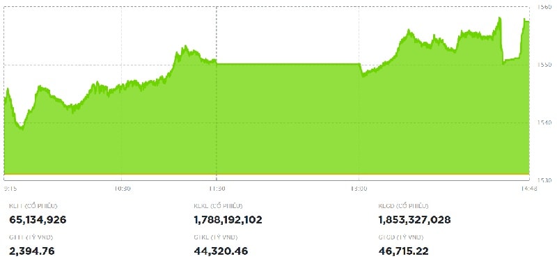 VN-Index lập đỉnh lịch sử mới 1.557,42 điểm trong phiên kỉ niệm 25 năm thành lập TTCK Việt Nam. Sắc xanh phủ thị trường. Nguồn: HSX