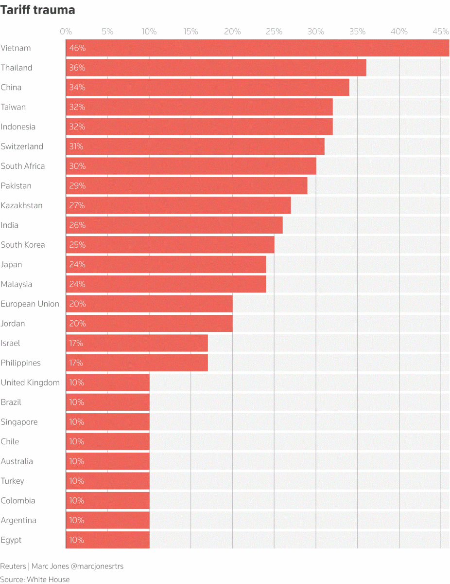 Các nhà máy ở châu Á đã chịu ảnh hưởng đặc biệt lớn từ mức thuế quan mới của Tổng thống Donald Trump. Sáu trong số chín quốc gia Đông Nam Á trong danh sách chịu mức thuế quan từ 32% đến 49% của Tổng thống Donald Trump. Sri Lanka, quốc gia đang phục hồi sau cuộc khủng hoảng kinh tế tồi tệ nhất trong một thế hệ, đã phải chịu mức thuế 44%.