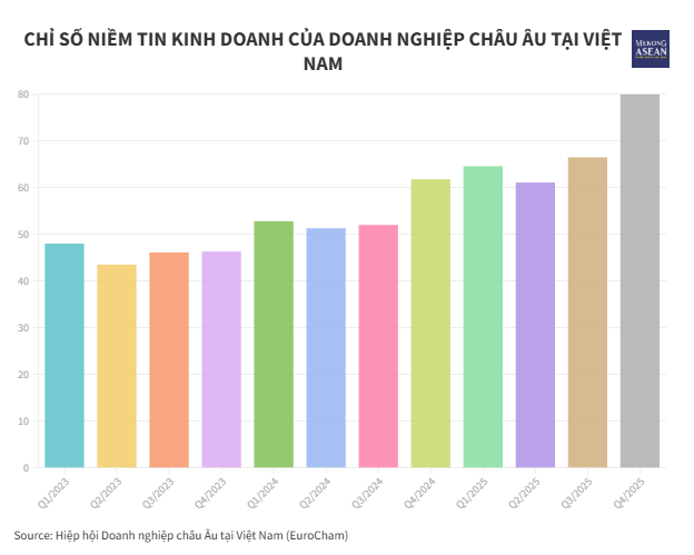 Ngày 13/1/2026, Hiệp hội Doanh nghiệp châu Âu tại Việt Nam (EuroCham) công bố Chỉ số Niềm tin Kinh doanh (BCI) quý 4/2025, với mức điểm 80. Kết quả này cho thấy một bước chuyển rõ ràng, niềm tin không chỉ được củng cố, mà còn đang trở thành động lực cho các quyết định mở rộng và đầu tư trong giai đoạn tới.