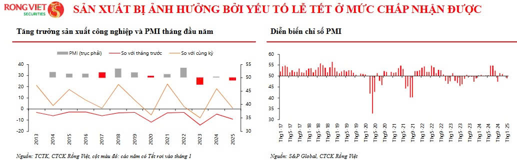 Chỉ số PMI không được tích cực bằng diễn biến của hoạt động sản xuất công nghiệp khi đang trong vùng thu hẹp ở mức 48,9 điểm trong tháng đầu năm, thấp hơn mức 49,8 trong tháng 12. Tuy nhiên, tồn kho thành phẩm giảm mạnh trong khi lượng đơn hàng mới chỉ giảm nhẹ có thể dẫn đến kỳ vọng doanh nghiệp (DN) sẽ trở lại sản xuất tích cực hơn sau kỳ nghỉ Lễ.