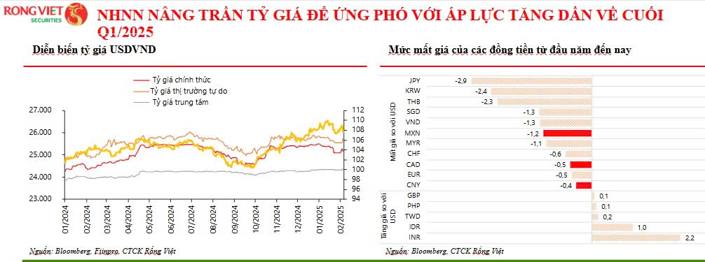 "Với nhu cầu trả nợ của Tập đoàn tư nhân và Kho bạc nhà nước tăng trong thời gian tới cùng với việc tăng nhập khẩu nguyên liệu phục vụ cho sản xuất và xuất khẩu có thể khiến áp lực mất giá tiền đồng tăng dần về cuối quý I/2025…", Báo cáo nhận định.
