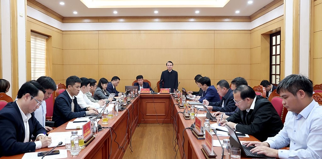 Bí thư Tỉnh ủy Ninh Bình Đặng Xuân Phong làm việc với UBND tỉnh về hiện trạng, phương án phát triển khu công nghiệp, cụm công nghiệp. Ảnh: BNB