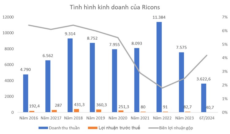 6 tháng đầu năm 2024, Ricons ghi nhận hơn 3.622,6 tỷ đồng doanh thu bán hàng và cung cấp dịch vụ, giảm 5,2% so với cùng kỳ năm ngoái. Trong đó, hoạt động xây dựng mang về 3.517 tỷ đồng (giảm 7%), mảng bất động sản tăng trưởng 226,2% với doanh thu 104,4 tỷ đồng. Sau khi trừ chi phí giá vốn, Ricons ghi nhận 154,5 tỷ đồng lợi nhuận gộp, tăng trưởng 137%, qua đó cho thấy dấu hiệu tích cực từ biên lợi nhuận gộp, tăng từ 1,7% lên 4,2%.
